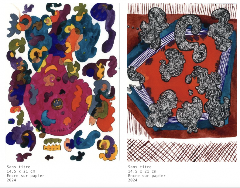Les dessins à l’encre d’Emmanuelle Messika prolongent ce geste autrement. Là, plus de couleur pour amortir. Juste le trait, répétitif, obsessionnel, presque nerveux. Des formes qui se répètent, se contaminent, envahissent l’espace. On n’est plus dans la représentation, mais dans un flux mental qui se matérialise.