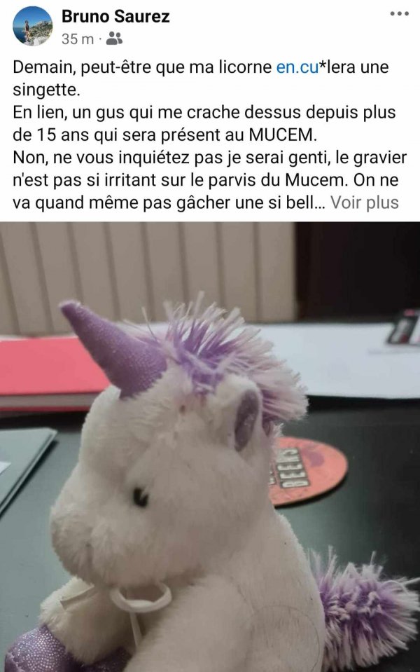 Mon séjour à Marseille fut des plus agréables sous un soleil radieux à me friser les poils. Ce serait sans compter sur la présence pointue d’une licorne qui me harcela dans les travées de l’expo devant témoins, lors de l’inauguration. Avec des intentions belliqueuses marquées, de s’en prendre au fondement même de mon intimité. A se jouer au méchant barbu lapidaire avec les gravillons qui peuplent le sol de l’esplanade du Mucem. Je vous laisse juge de ses propos et des maux qu’il a diffusés sur les réseaux sociaux !