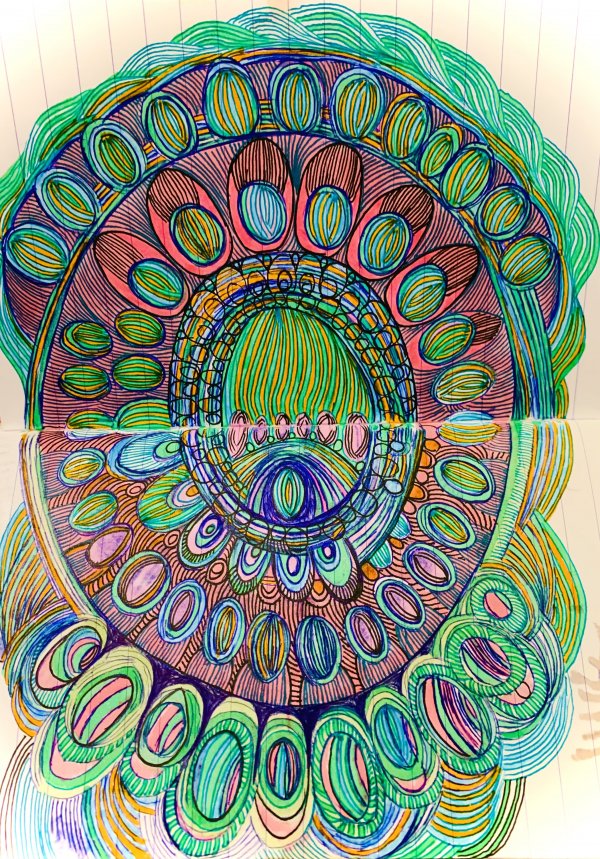 Mes feutres, je les utilisent comme des aiguilles. Je trace des lignes telles des points de suture symboliques sur les plaies de ma vie. Je dépose des couleurs sur la feuille comme je pourrais déposer des fleurs de couleurs sur une tombe. La société ne voit pas ce que je suis. Elle ne ressent pas ce que je ressens, ne voit pas ce que je vois, n’entend pas ce que j’entends. Elle m’a enterré vivante ! Hey ! Ouvrez ce cercueil !!! Vous ne m’entendez pas ??!!