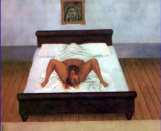 La scène peut sembler crue, tout au moins originale. Elle fait en réalité directement référence à la statuaire aztèque et à l’art précolombien. Frida Kahlo, née au Mexique en 1907, revendique dans nombre de ses tableaux son appartenance à la culture traditionnelle de son pays.