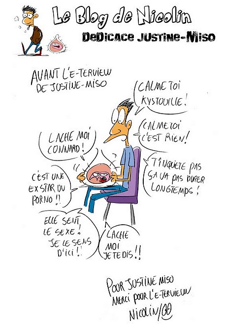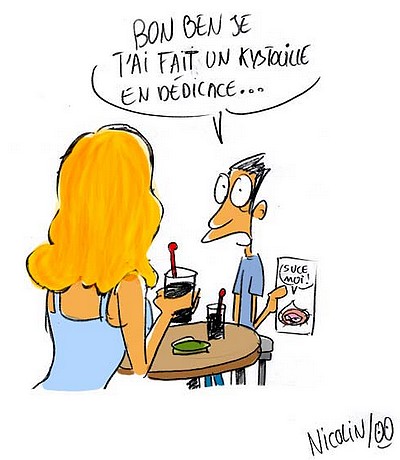 Nicolin : Ben écoute moi je te propose de t’offrir un verre dans un bar tranquille et je te ferais une belle dédicace pour te remercier de cette superbe e-terview et attention, t’es même pas obligé de me sucer le gnocchi pour la dédicace !
