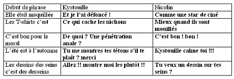 Kystouille calme toi, pour le moment, je ne vais interroger que Nicolin. Mais arrête enfin ! Qu’est-ce que tu as avec mon décolleté ! Mais oui je suce pour un dessin mais je te montrerai mes seins après ! Je n’ai pas encore eu le dessin.