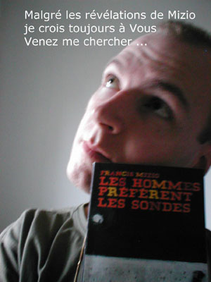 Monsieur Mizio, je vous trouvais jusqu’à présent bien sympathique, mais mon estime pour vous en a sérieusement pris un coup. Vous avez anéanti mon rêve extra terrestre. Vous avez changé ma vie, et plus jamais je ne pourrai avoir l’espoir d’être victime d’un enlèvement (bien qu’ayant souscrit au contrat d’assurance contre l’enlèvement par des OVNI de Karl et Bébert !).