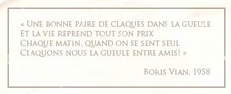 A la fin des années 50, Boris Vian, aidé par une fraction dissidente du collège de Pataphysique, a entrepris de donner un nouveau souffle aux activités du Comité de la Claque. Il a mobilisé courageusement tout son talent pour diffuser notre philosophie dans la sphère publique et a notamment participé à la rédaction d’une grande charte qui guide depuis près d’un demi-siècle notre action salvatrice. Merci Boris !