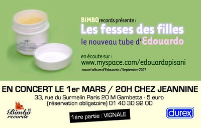 Le Label BIMBO RECORDS fait fort en mettant à l’affiche, le plus ringard des italiens en exil en France Edouardo Pisani (Je t’aime le lundi) et l’artiste multiface hyper médiatisé depuis quelques mois et que la branchouille s’arrache, de Technikart à Télérama en passant par la Revue Médias, France 2, Direct 8 et toute la Blogosphère.