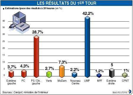Les électeurs ont confirmé leur vote 5 semaines après l’élection présidentielle, en apportant plus de 41% de leurs voix aux candidats présentés par l’UMP. 27% des suffrages se sont portés sur ceux du Parti socialiste, 7,5% sur le MoDem, 4,5% sur le Parti communiste et autant sur l’extrême-droite. Le 1er tour des législatives, qui a connu un record d’abstention, 39,5% des inscrits, a témoigné de la montée en puissance de la majorité présidentielle, et grâce aux effets du mode de scrutin, le Nouveau Centre devrait obtenir une vingtaine de sièges avec tout juste 2% des voix, tandis que François Bayrou, en ballottage favorable à Pau, devrait représenter le MoDem tout seul à l’Assemblée nationale. Le score du Parti socialiste demeure honorable, en légère progression par rapport à 2002, mais pour des raisons identiques, il se traduirait par un recul en nombre de sièges. Ségolène Royal y a vu les conséquences de la faible mobilisation des électeurs. François Fillon, Premier ministre, est élu dans la Sarthe avec 53,5% des voix, ainsi que ses collègues Jean-Louis Borloo, Xavier Bertrand, Hervé Morin. Il y aura dimanche une session de rattrapage pour Alain Juppé, Michèle Alliot-Marie et Roselyne Bachelot. Selon les projections, l’UMP obtiendrait de 400 à 450 sièges, le PS entre 100 et 140, et il n’y aurait pas d’autre groupe parlementaire, hormis celui du Nouveau Centre, qui s’est inscrit dans la majorité présidentielle.