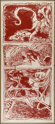 L’art est une fiction intemporelle qui nous offre une connaissance essentielle venue des assises du monde. Cette exposition est extraordinaire, mais la tête me tourne. Arrêtons-nous un instant sur une toile de 1967, Le Théâtre des Armées, un grand carré avec en son centre une toile aux imprécations rouges, et toujours cette frise qui encadre, par petits carrés, sorte de bande dessinée qui narrerait l’histoire du tableau. PA. les nomme remarques marginales car elles favorisent un devenir de l’image qui rompt avec la fixité classique du tableau tel que nous le concevons. Je m’approche, je me penche, et … miracle, j’entends la voix du maître qui s’épanche : "Ces éclaboussures jaune, orange … Des bombes ? Des lance-flammes ? Tout au plus le plaisir de jeter de la couleur. Taches de verroteries d’un lampadaire de Tiffany’s. Tout de même, ce bleu … Ce n’est plus un bleu de lessive pacifique. Plutôt le pigment des années de guerre passées : ces badigeons de Prusse sur la nuit que n’éclairaient plus les fenêtres.