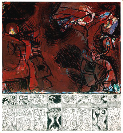 Alechinsky est un économe, un funambule qui recherche un "équilibre entre la fulgurance de la ligne tendue vers l’avant, et la présence, concrète sinon palpable, de ce même trait gagné par l’incertitude." Il choisira l’expérimentation, passant du crayon au pinceau, voyant dans la gymnastique des signes un sens caché qu’il faut mettre en avant, une manière de dire le silence du signifié pour que la mémoire accompagne l’image comme lieu d’interrogation permanent dont le signe plastique porte la marque.