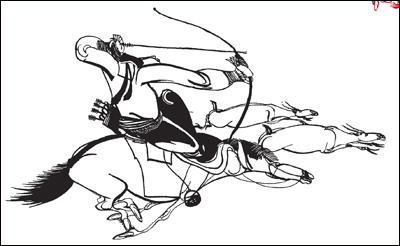Grâce au travail minutieux du calligraphe Purev, illustrant avec minutie sentences et maximes qui rythment le quotidien nomade, la lecture se fait doucement, page à page, entre les mots et les formes : choix des couleurs, sceaux réinventés, formes toutes de légèreté émouvantes. Et parfois, au détour d’une page, les délicates illustrations à l’encre de Byambarenchi apportent un contrepoint graphique à quelques extraits, judicieusement placés, du Voyage en Mongolie de M.& Mme de Bourboulon, ambassadeur de France et son épouse, daté de 1860-61, raconté par Achille Poussielgue. Un lien invisible se tisse entre ces deux mondes, et l’on s’amuse de voir que les descriptions enthousiastes des paysages et des hommes semblent étonnamment contemporaines. Comme si ce monde des steppes était immuable … et ces cavaliers peints qui traduisent les émotions, les espoirs et la recherche de la liberté, en perpétuel miroir de nos existences si figées. Généralement construites à partir de scènes de la vie quotidienne, ces peintures rapportent fidèlement le monde tel qu’il est ressenti par la personnalité de l’artiste.