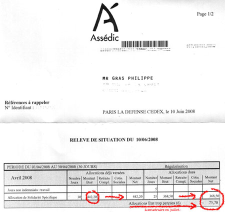 Le plaisir a été renouvelé lorsque j’ai reçu pour prix du flicage de ces étudiants sympathiques la somme incroyable de 812,58 euros, pour une dizaine de jours seulement de glandouille intense dans le hall d’entrée de l’établissement. C’était trop beau : j’ai trouvé dans ma boîte aux lettres le relevé de situation des Assedic que je reçois tous les mois pour m’informer que la solidarité nationale encourage une indécrottable paresse avec 442,20 euros, mais aujourd’hui, le compte n’y est pas. Non contents de suspendre leur versement, dans la mesure où j’ai déjà encaissé près du double grâce aux bons soins d’une entreprise privée, ils me retiennent la somme de 73,70 euros le mois prochain et minorent le montant de mes droits, qui s’élèvent désormais à 368,50 euros…