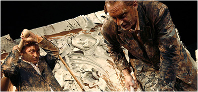 Ultime confirmation de cette posture, la performance de Miquel Barceló et Josef Nadj en l’église des Célestins, en Avignon (été 2006), durant laquelle, pendant une heure, il a fait apparaître, à partir d’un mur d’argile, des formes de bêtes, des têtes archaïques, ou tracé des signes aussi énigmatiques que ceux retrouvés à Lascaux, Chauvet ou Altamira. Quand il ne bombarde pas son partenaire de boules de terre, Barceló laisse ses mains agir : d’un geste simple il crée des fragments de corps et, ce qui ressemble à un squelette, pourrait tout aussi bien évoquer un Christ intemporel ou une plante séchée. Dans cet éphémère qui rappelle Christian Jaccard quand il va brûler des murs, tout est possible, tout est permis. A l’œil de se jouer des évidences et de puiser dans les souvenirs pour lire autre chose : les fresques des grottes du Périgord ou les peintures de Giotto.