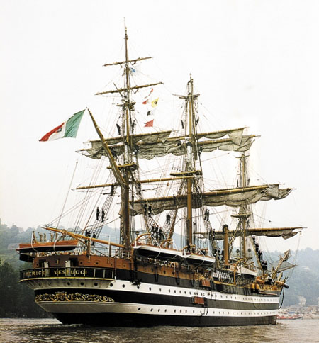 Lancé en 1931 à Castellamare, cet imposant trois-mâts de 101 mètres de long porte le nom du navigateur florentin qui donna son nom au nouveau continent. L’Amerigo Vespucci, véritable musée flottant, navigue souvent en Méditerranée, pour l’instruction des élèves officiers de l’école navale italienne. Son port d’attache est La Spezia, importante cité marchande, qui comprend l’Arsenal de la Marine militaire dans une importante base de la marine italienne, un musée naval et plusieurs chantiers navals.