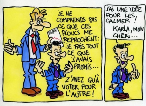 Oui, je suis archi lassé de ces déçus du sarkozysme qui tous les jours viennent me voir, au café, au boulot, en famille, pour se plaindre à moi, certains qu’ils sont d’être bien reçus… alors qu’ils ont été les premiers à voter Sarkozy et à s’en vanter à l’époque ! Ils devraient pourtant être satisfaits : Sarkozy ne fait ni plus ni moins que ce qu’il avait programmé et annoncé dans le texte, il faut bien lui reconnaître cela ! Alors… ?