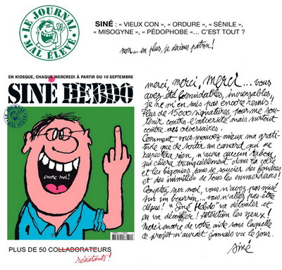 SIné viré, Siné sème désormais à partir du 10 septembre son propre hebdo, avec déjà près de 50 résistants pour l’accompagner dans ce nouveau journal, en vente dès le mercredi 10 septembre, dans tous les bons kiosques. Le combat continue dans la provocation, le parler franc, et sans excuses à faire auprès des religions ou de l’Elysée.