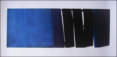 En 1971, toujours dans les mêmes tailles monumentales, mais avec un invité, le bleu. Ainsi, les simplifications ramenant toujours Soulages au seul noir s’en voient dénoncées car ces toiles témoignent massivement de l’importance de la couleur bleue dans son œuvre ; couleur à laquelle il est régulièrement revenu, même après sa découverte de l’outrenoir, qu’il a souvent combiné avec elle … Cet accord noir/bleu est un classique de la peinture qui a toujours intrigué Soulages ; en 1996, il confiait à Pierre Encrevé : "Le rapprochement d’un noir et d’un bleu a toujours quelque chose d’assez sensuel, on s’y livre avec une certaine volupté."