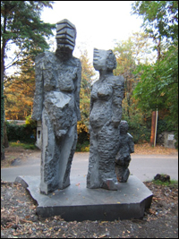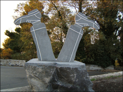 Une première encore que cette route en lacets qui monte vers le cratère en exposant, fruits de ses coulées de mars 1944, des œuvres faites de la même lave, en une harmonie unique… Dix artistes qui ont trouvé leur place au hasard d’un tirage au sort qui fit bien les choses puisque L’Ange de feu d’Alekos Fassianos, dont le jeune homme ailé du bas-relief appelle les agapes et les feux du soleil couchant, se situe au plus haut vers le cratère. Hasard encore qui positionna Liestening with the Eyes de Mark Brusse est la première station de ce chemin , avec son haut regard antique démultiplié aux quatre coins de l’horizon…