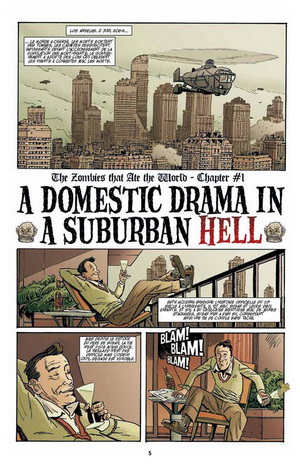 Ces faits divers ont été regroupé depuis une publication dans la série du même nom mais en français « les Zombies qui mangent le monde ». (saison 1 – 4 tomes disponibles aux Humanoïdes Associés) , de la petite nouvelle bien saignante, ça cogne, ça tranche, ça mâche bien, le zombi a même une certaine libido sexuelle, il est attirant au féminin. Au scénario, un plus du tout belge (d’ailleurs.. le Freddy est inspiré d’un grand cycliste belge … Mercks ! D’ailleurs c’est le nom de famille de « The Belgian ») implanté aux USA depuis son adolescence. Jerry Frissen pose ici un drôle de futur d’anticipation sur un trop plein du ciel , alors sur terre , les zombis débarquent, essayent de vivre parmi les vivants, et parfois encombrent le quotidien, ou font l’objet de divers marchés noirs comme l’Art, le showbiz Hollywoodien.. des clichés de la culture américaine perturbées et décalés, où on attend qu’un vivant meurt pour profiter de son aspect de zombie, et ça en devient même une drôle de coutume pour les riches de Los Angelès. Les faits divers font l’histoire de ce groupe, des GhostBusters, ou les civils de « Bienvenue à Zombieland », frôlant l’incivisme, parfois se mêlant au gouvernement via une agence très secrète.