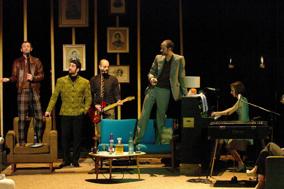 Alexis Armengol s’est imprégné de cette œuvre, choisissant la traduction d’André Markowicz et Françoise Morvan. Avec finesse, tout en évitant malicieusement les formes narratives traditionnelles, il nous propose ce Platonov mais, agréable apéritif tchékhovien, servi sous la forme d’un théâtre-concert. Dialogues tumultueux, chant et musique (piano et guitare) viennent se frotter à l’attention du spectateur durant deux courtes heures. Platonov mais débute par des retrouvailles entre amis lors d’un week-end. Platonov, personnage central mais indéterminé, nous y apparaît sous des traits sarcastiques, tantôt enfantins, tantôt emplis de gravité. La pièce nous suggère son ascendant moral sur le petit groupe, constitué de Sergueï (fils du général Voïnitsev, mari de Sofia), Nikolaï (frère de Sacha, fiancé de Grékova), Anna (jeune veuve), Sofia (épouse de Sergueï) et Sacha (épouse de Platonov), et plus particulièrement la fascination – parfois répulsive – qu’il exerce sur les trois derniers personnages.