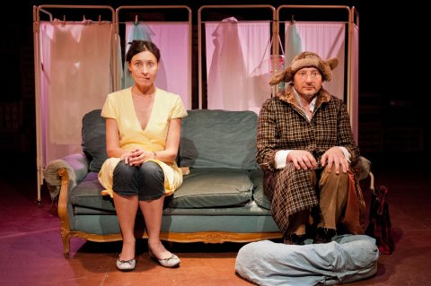 Le spectacle, habilement mis en scène par Nathalie Boutefeu, débute par les confidences du Chien - cabot sans nom appelé « Va te faire foutre » par son dernier propriétaire -, qui nous énumère toutes les vexations subies au cours de sa pauvre vie. Ce clébard un peu philosophe va trouver auprès de la Vétérinaire une oreille compatissante, l’amenant tout droit à une thérapie improvisée. La métaphore animale - et la transposition théâtrale de sentiments humains vers ce toutou, lecteur de Jung et de Freud - se profile subtile et drôle dans Un chien dans ma vie. [Avec un thème pareil, sauf exception genre Olga ma vache de Dubillard, l’on peut vite tomber dans le clin d’œil nunuche ou la sociologie de bazar (!)] Parallèlement aux particulières séances psychanalytiques du Chien, le fonctionnement du cabinet de vétérinaire nous est montré dans toute sa quotidienneté speed. L’ironique espace scénographique, accentué par les vêtements surannés de la Vétérinaire et du Chien, nous met face à ce couple improbable. Ce dernier jongle dans un univers absurde, imprégné de craintes de grand-mère, d’histoires de puces de chien, de demandes d’euthanasie, de morsures problématiques de chats ou rats, et de continuelles sonneries de portable...