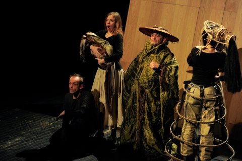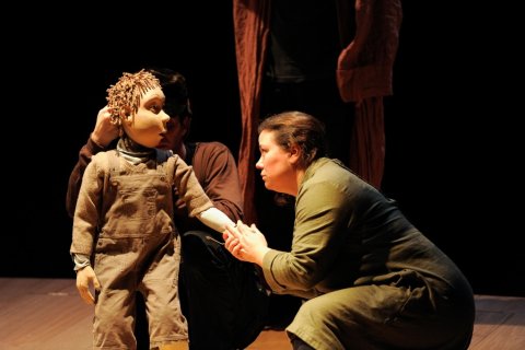 Puis, dans une seconde partie, l’épouse du gouverneur (Natella Abaschvili), qui veut récupérer Michel, assigne en justice sa servante. Le juge (Azdak), personnage loufoque, tranche à sa façon le litige. Même si la pièce pâtit du texte parfois ampoulé de Brecht et de personnages trop stéréotypés (Natella ou le fiancé de Groucha), elle séduit fortement par son mystérieux climat, l’excellence du jeu des comédiens et la crudité sociale du message. Pièce chorale à la scénographie sobre et raffinée, elle enveloppe le spectateur d’un bel élan chorégraphique de lumières et de visages/masques expressifs. Les multiples personnages emblématiques du Cercle de craie caucasien évoluent sur un plateau habité par d’insolites plans de bois inclinés. Ils sont là revêtus de curieuses coiffes de cirque ou d’inquiétants masques de crânes de buffles. Quant à la présence de Michel, elle est subtilement incarnée par le fragile déhanchement d’une marionnette.