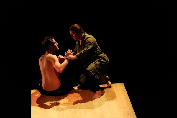 Puis, dans une seconde partie, l’épouse du gouverneur (Natella Abaschvili), qui veut récupérer Michel, assigne en justice sa servante. Le juge (Azdak), personnage loufoque, tranche à sa façon le litige. Même si la pièce pâtit du texte parfois ampoulé de Brecht et de personnages trop stéréotypés (Natella ou le fiancé de Groucha), elle séduit fortement par son mystérieux climat, l’excellence du jeu des comédiens et la crudité sociale du message. Pièce chorale à la scénographie sobre et raffinée, elle enveloppe le spectateur d’un bel élan chorégraphique de lumières et de visages/masques expressifs. Les multiples personnages emblématiques du Cercle de craie caucasien évoluent sur un plateau habité par d’insolites plans de bois inclinés. Ils sont là revêtus de curieuses coiffes de cirque ou d’inquiétants masques de crânes de buffles. Quant à la présence de Michel, elle est subtilement incarnée par le fragile déhanchement d’une marionnette.