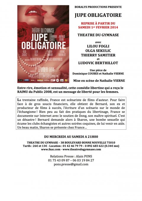 Reprise de la pièce "JUPE OBLIGATOIRE" au Théâtre de Gymnase. Qu’on se le dise !!