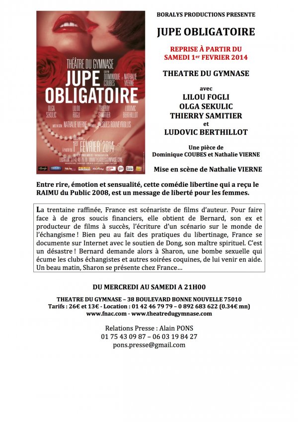 Reprise de la pièce "JUPE OBLIGATOIRE" au Théâtre de Gymnase. Qu’on se le dise !!
