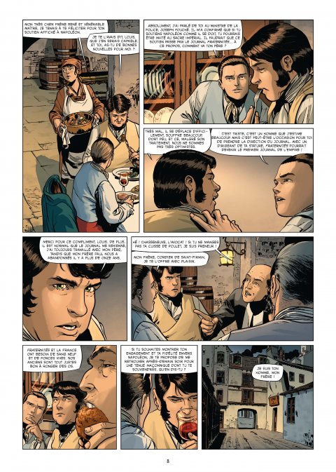 Jean-Christophe Camus au scénario et Bernardo Munoz ouvrent un second tome de la famille Baudecourt aux manettes du journal « Fraternités » mais aussi liée aux destinées de la franc-maçonnerie. Sous l’Empire, Fouchet sinistre de l’intérieur désire prendre le pouvoir sur le journal afin qu’il devienne un organe de propagande du régime et ainsi noyauter les loges maçonniques. Suivez l’intrigue haletante dans le Paname de cette période où les complots, magouilles de toutes les sortes sévissaient déjà dans l’antre du pouvoir. A nouveau du grand art pour cet ouvrage fignolé qui nous fait découvrir de l’intérieur une époque troublée et le rôle des francs-maçons.