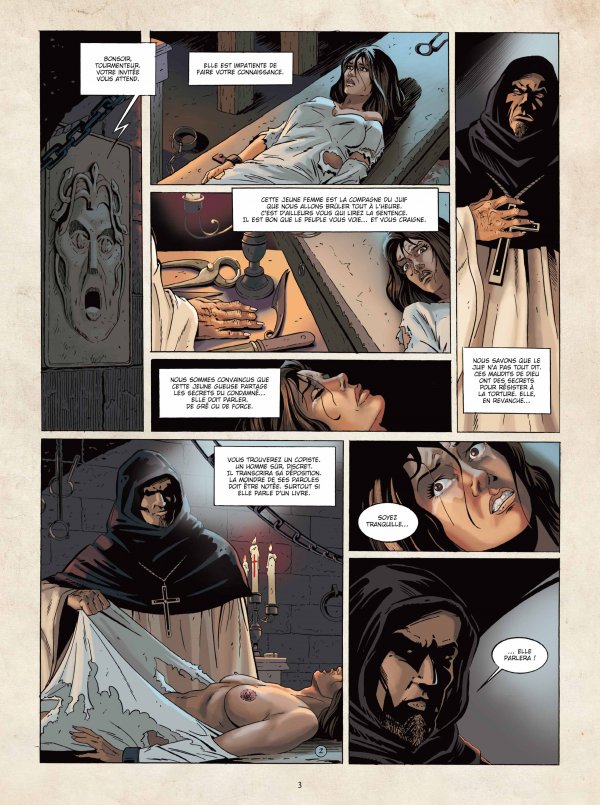 Tout commence à Paname en 1355, un soi-disant sorcier juif a été jugé et torturé par l’Inquisition et brûlé vif sous la vindicte populaire. Isaac Benserade considéré comme le serviteur du diable n’a pas craché le morceau de son don d’alchimiste, capable de transformer la matière en or. Qu’à cela ne tienne, sa superbe jeune femme brune parlera à sa place sous le joug du Tourmenteur, membre officiel de la sainte-mère l’église.