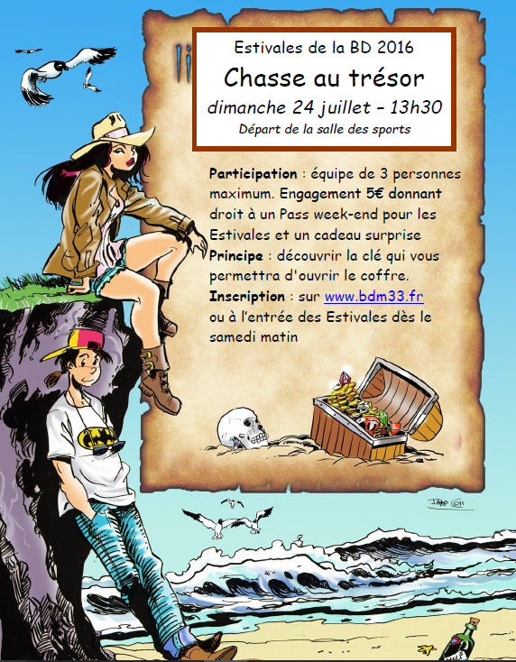 Parmi les animations qui seront proposées entre le samedi 23 et le dimanche 24 juillet, j’ai retenu la « Chasse au trésor », dimanche à 13 h 30 au départ de la salle des sports de Monta. Des équipes de trois personnes évolueront autour d’énigmes à résoudre pour remporter peut-être le coffre au trésor qui recèle moult BD. Autre activité intéressante, il y aura un atelier BD avec l’artiste Ström samedi et dimanche de 14 h 30 à 16 h.