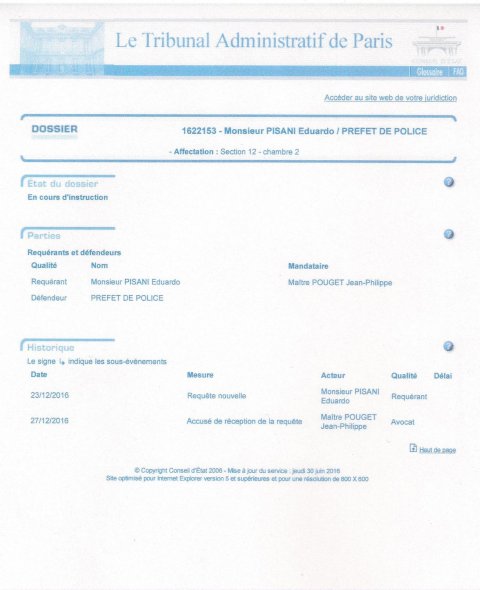 4 janvier 2017. J’ai un avocat. Le recours en annulation de mon expulsion de la France a été déposé devant le tribunal administratif de Paris.