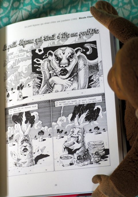 Retour aux années 70 / 80 et les souvenirs du Bartos ado boutonneux à la queue leuleu qui adorait déjà se plonger dans les tremblements oniriques de Nicole Claveloux entre les pages de la revue « Ha ! Nana ». Oh joie de la redécouvrir quelques décennies après toujours intacte d’émotions à filer un Trafalgar aux vegans qui me tapent sur le système pileux, avec son « Petit légume qui rêvait d’être une panthère » (1980) mais aussi encore d’autres de ses histoires entre les pages de Nicole. Un grand merci Nicole tout court et Nicole Claveloux ! Mais oui, c’est bien sûr, les deux supers nanas portent le même gentil blaze. Je n’avais pas tilter au départ !