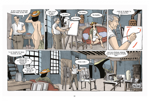 Dans son atelier parisien, son modèle Dora Maar pose, dialogue et l’encourage. Picasso se désespère : « Ca fait des mois que je cherche une idée. Et rien ne vient de vraiment bon » (page 16). C’est finalement le 30 avril lors de la diffusion des informations en images dans un cinéma parisien que Picasso a un déclic : Guernica ! Il entreprend de couvrir de ses chimères une toile de 7,50 m sur 3, 50 pour illustrer son ressenti de Guernica. « J’y retrouve toute la souffrance, l’horreur et la furie de la guerre » commenta Dora (page 65). Très complice, elle entreprend des clichés photographiques qui vont permettre au peintre d’avoir le recul nécessaire qui lui manque devant l’étendue de sa fresque monumentale. Il veut capter le public et considère cette toile comme une arme contre Franco et le fascisme. Il est à noter que Bruno a bénéficié de l’accord de la Fondation Picasso pour publier sa BD.