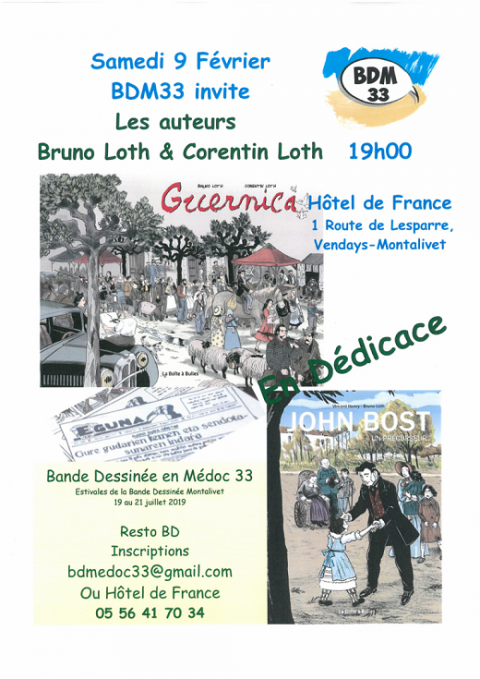 Oyez oyez, ne boudez pas votre plaisir de rencontrer Bruno et Corentin Loth qui seront présents, à l’invitation de l’association BDM33, samedi 9 février 2019 au resto chez Gilles et Marika de Vendays Montalivet, à partir de 19 h pour discuter et dédicacer.