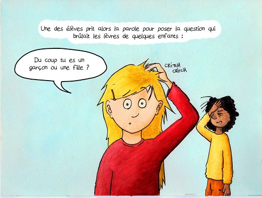 Nao a une réplique cinglante et de bon sens du genre : « Vous savez, c’est pas clair vos histoires. Un coup je suis un garçon, mais en fait je suis une fille, mais en fait je suis plutôt un garçon. Ca me casse la tête tout ça. Moi je crois que c’est à personne de décider qui je suis. Il y a que moi qui peux savoir, et je choisis ni l’un ni l’autre. Je veux pouvoir jouer à ce que je veux, un point c’est tout ».