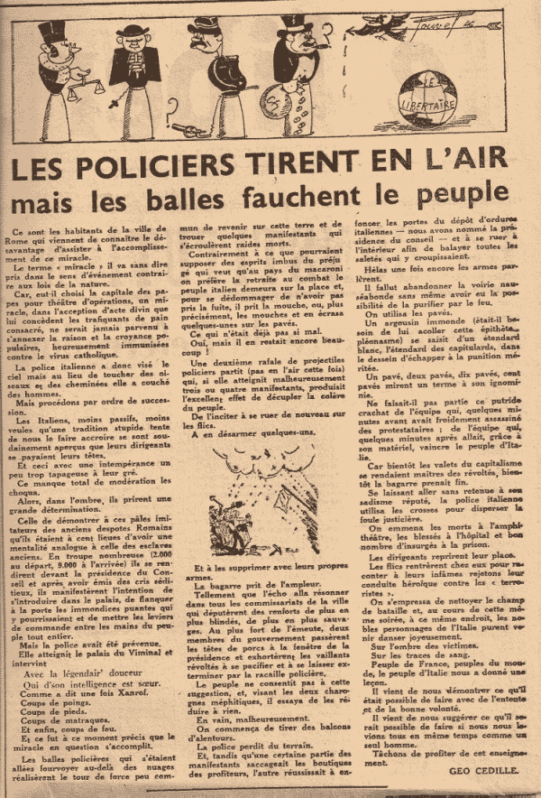 Dans l’ouvrage de Frédéric Bories, il n’est nullement question de ces périodes fastes. C’est entre 1946 et 1947 qu’il aiguise sa plume trempée dans le vitriol, qu’il publie ses chroniques pour le libertaire sous différentes pseudos. Les titres sautent au visage et sans faux sans semblants du style : « Vilains propos sur la maréchaussée » / « Le hasard s’attaque à la police » / « Au sujet de la bombe atomique » / « Aragon a-t-il cambriolé l’église de Bon-Secours ? » / « Les grandes résistances » / « Le chemin du clavaire » / »Les bienfaits de l’humanité » / « Les bienfaiteurs de l’humanité » / « Idée de patrie bouée du capitalisme »…