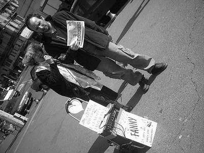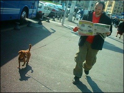 J’attends en bas des marches blanches qui jouxtent la Gare de Marseille St-Charles. Saucisse est, quant à lui, en haut pour m’accueillir et je dois ainsi remonter l’immense escalier de lumière pour rejoindre enfin mon fidèle compagnon littéraire à quatre pattes. Les artistes sont des cabots, saucisse en est la plus parfaite illustration. Le célèbre teckel à poil ras est accompagné de son maître et sa maîtresse Serge Scotto et Elsa.