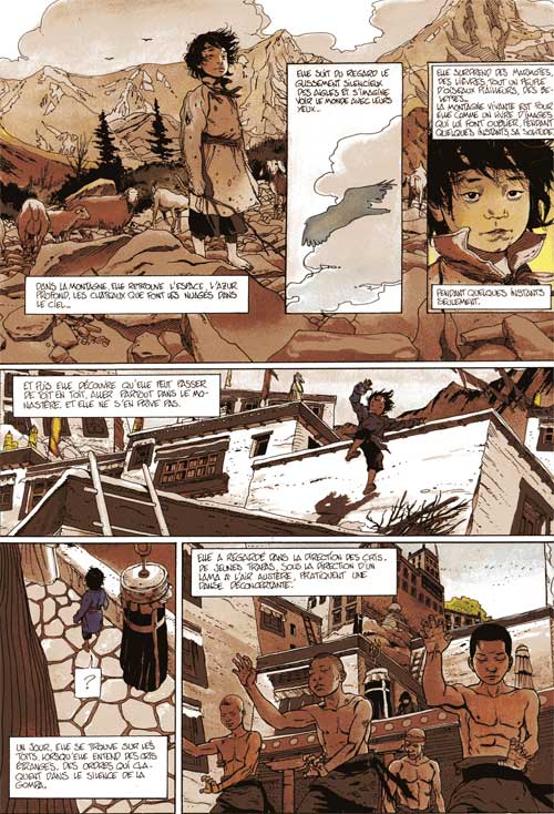 Pour cette nouvelle série pour la collection REPÉRAGES, George Bess (dessin et scénario), s’inspire de ses nombreux voyages au Tibet, et après des séries comme le LAMA BLANC (avec Jodorowsky), l’auteur use avec bonheur de son talent de narrateur, allant du passé au présent, usant des couleurs des différents tons sépias et ocres pour nous plonger dans la plus amples des ambiance théâtrale du Tibet.