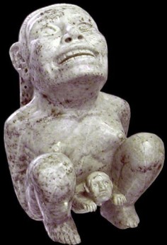 Dans les légendes aztèques il y a cette histoire autour de la déesse Coatlicue : un jour qu’elle était en prière dans un temple une boule de duvet lui tomba sur la poitrine et quelques temps plus tard sa fille s’aperçut que sa mère était enceinte. Furieuse et croyant au déshonneur de sa mère, elle poussa ses frères à décapiter leur mère. Sortant alors du ventre de sa mère agonisante, un dieu naquit, tout armé et peint en bleu. Il tua sa soeur, ses frères et tout ceux qui avaient comploté contre sa mère.