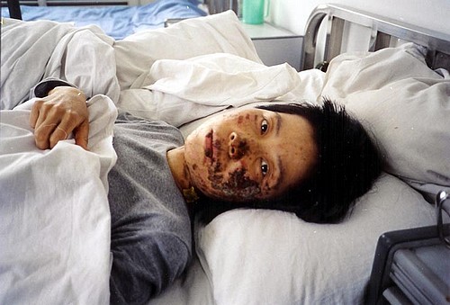 Le 7 mai 2004, au camp de travail forcé de Longshan, deux policiers ont menotté Mme Gao Rongrong à un tuyau de chauffage et l’ont électrocutée avec trois matraques électriques continuellement pendant sept heures. Son visage a été gravement brûlé. Cette photo a été prise dix jours plus tard.