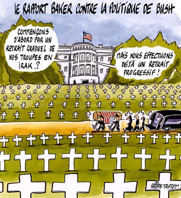 Le rapport Baker, du nom du républicain James Baker, coprésident du Groupe d’étude sur l’Irak, prévoit sans précisions ni calendrier précis un possible retrait de troupes américaines d’ici au premier trimestre 2008.