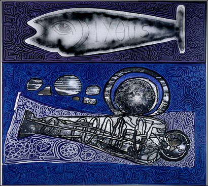 Ici même, donc, il a su faire venir à lui les formes de Combas, cette fougue et ce ressac se conjuguant pour donner à chaque scène une situation/forme unique. Combas et Kijno ont su maintenir une tension exaltée jusqu’à l’apothéose, cette Descente de Croix (14e et dernière station) dans laquelle ils imprimèrent toute l’ampleur de leur vision dans le processus de libération du corps. Jésus n’est pas mort, seul son corps est éteint, mais demeure intacte l’idée même du Verbe. Pour se faire, nos deux irrévérencieux artistes ponctuèrent ce diptyque d’une anagramme grecque – I Ch Th U S – que les premiers Chrétiens des catacombes romaines déchiffraient en cachette, à partir de chaque lettre : "Iesus Christos Theou Uios Sôtre", soit Jésus-Christ, fils de Dieu, Sauveur.