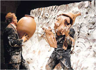 Ultime confirmation de cette posture, la performance de Miquel Barceló et Josef Nadj en l’église des Célestins, en Avignon (été 2006), durant laquelle, pendant une heure, il a fait apparaître, à partir d’un mur d’argile, des formes de bêtes, des têtes archaïques, ou tracé des signes aussi énigmatiques que ceux retrouvés à Lascaux, Chauvet ou Altamira. Quand il ne bombarde pas son partenaire de boules de terre, Barceló laisse ses mains agir : d’un geste simple il crée des fragments de corps et, ce qui ressemble à un squelette, pourrait tout aussi bien évoquer un Christ intemporel ou une plante séchée. Dans cet éphémère qui rappelle Christian Jaccard quand il va brûler des murs, tout est possible, tout est permis. A l’œil de se jouer des évidences et de puiser dans les souvenirs pour lire autre chose : les fresques des grottes du Périgord ou les peintures de Giotto.