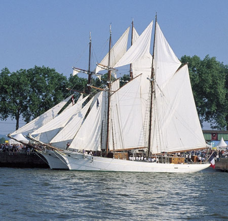 Toutes ses voiles sont enverguées et leur vergue est horizontale, retenue par le milieu. On parle de voiles carrées. Le mât d’artimon à l’arrière conserve en plus une brigantine à corne.