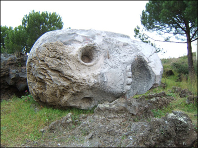 Une première encore que cette route en lacets qui monte vers le cratère en exposant, fruits de ses coulées de mars 1944, des œuvres faites de la même lave, en une harmonie unique… Dix artistes qui ont trouvé leur place au hasard d’un tirage au sort qui fit bien les choses puisque L’Ange de feu d’Alekos Fassianos, dont le jeune homme ailé du bas-relief appelle les agapes et les feux du soleil couchant, se situe au plus haut vers le cratère. Hasard encore qui positionna Liestening with the Eyes de Mark Brusse est la première station de ce chemin , avec son haut regard antique démultiplié aux quatre coins de l’horizon…