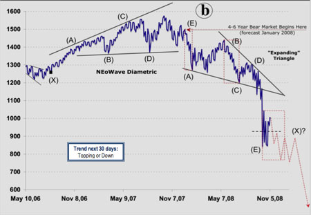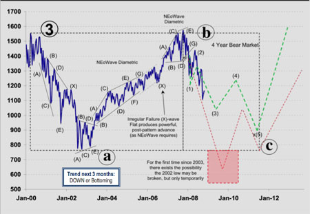 Son apport a été très technique, alors que celui de Robert Prechter appartient au registre des sciences humaines. Par ses études, Glenn Neely a, lui aussi, fait preuve d’un véritable génie, en donnant à la méthode une véritable dimension scientifique à la pensée initiée par Ralph N. Elliott. Il ne partage pas le pessimisme eschatologique de Robert Prechter, mais il pense au contraire que de nouvelles hausses se reproduiront sur les indices. Il est, par contre, très baissier sur le moyen terme, puisque selon lui, la baisse actuelle doit se poursuivre jusqu’en 2012, et verra le SP500, dont le sommet était proche de 1.600 points en 2007, descendre jusqu’à 500 points au cours des 4 années à venir.
