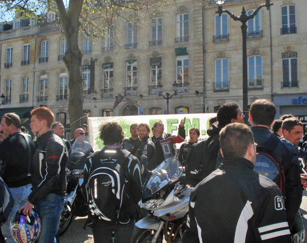 Allée de Tourny, ça commence bien, j’ai déjà le tournis. Bondées de monde, un type en gilet fluo aux cigles de la FFMC 33 accueille les manifestant(e)s et leur indique comment se ranger en épis sur plusieurs rangées. Le mélange détonnant des genres s’opère bonnard. Ici, les ziguettes et les zigues ont la parabole facile de la parole libre et font fi des différences de comportements de leur fidèle destrier. C’est étonnant, plus de mille ont répondu à l’appel de se bouger les carbus pour que toutes leurs voix soient entendues. Des passant(e)s honnêtes, sans pour autant en emporte le vent se bécoter sur les bancs publics, interpellent la foule en liesse sur les motifs de ce rassemblement. Des échanges agréables et respectueux s’engagent. Tous les thèmes chers aux motard(e)s sont passés au crible de leur mode d’existence. Une véritable formation à la route de tous les usagers dans le respect mutuel en tenant compte des spécificités de chacun ect riz ect rat et tout le tralala…. sans devenir la vache à lait des gouvernements successifs à toujours casquer au prix fort son équipement absolument nécessaire, puisque seule carrosserie.