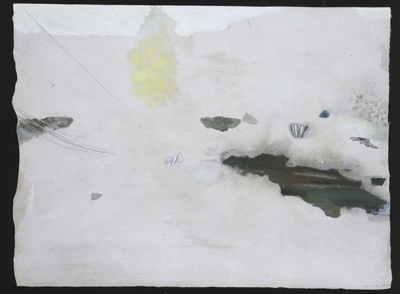 Les séries Nappes et Hippocrène ne sont pas des à-plats de sens où le désert se serait invité même si l’impression d’un sable omniprésent laisse le temps à l’œil de découvrir quelques objets oubliés (?) qui ne relèvent point d’un désordre. Au contraire, ils témoignent d’un ressac de la mémoire et d’un temps ancien où la montre s’oubliait pour laisser s’écouler les minutes et étudier tranquillement ce qu’il y avait à glaner autour de soi … Un coquillage représente-t-il bien un coquillage ou sa valeur doit-elle se lire en fonction de sa place dans le dessin, ou des traits de crayon – parfois plusieurs fois répétés – qui l’entourent ?