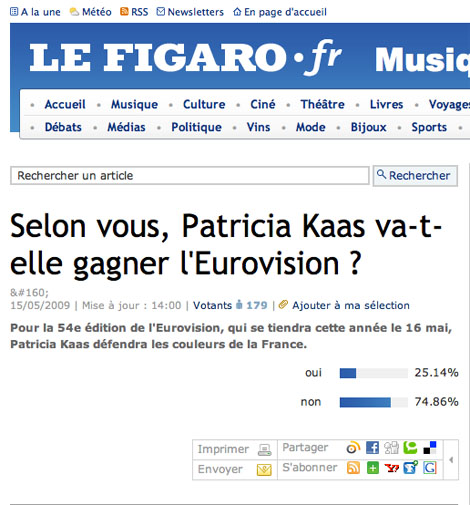 Les Français, pour leur part, n’y croient plus. Le site Internet du quotidien Le Figaro demandait à ses lecteurs de se prononcer sur les possibilités de victoire pour la France au concours de l’Eurovision 2009. Vendredi à la mi-journée, le résultat est déjà sans appel :