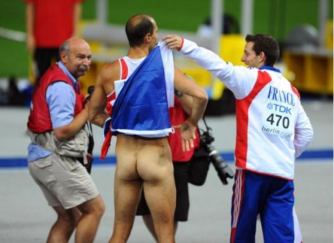 Steve Hooker empoche l’or pour l’Australie, et les deuxièmes places sont souvent les plus ingrates. L’athlétisme doit rester le temple où se manifeste le culte au corps, et quoi de plus naturel, au demeurant, que de montrer l’intégralité de son anatomie dans cette arène berlinoise ? Les dieux du stade grecs courraient tous nus, de manière à signifier que leurs performances ne sont pas le fruit d’une supercherie. C’est donc aussi à une grande tradition du sport que les fesses nues de Romain Mesnil font référence. Nous pouvons y voir une volonté toute neuve de refuser la fatalité.